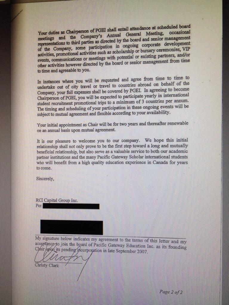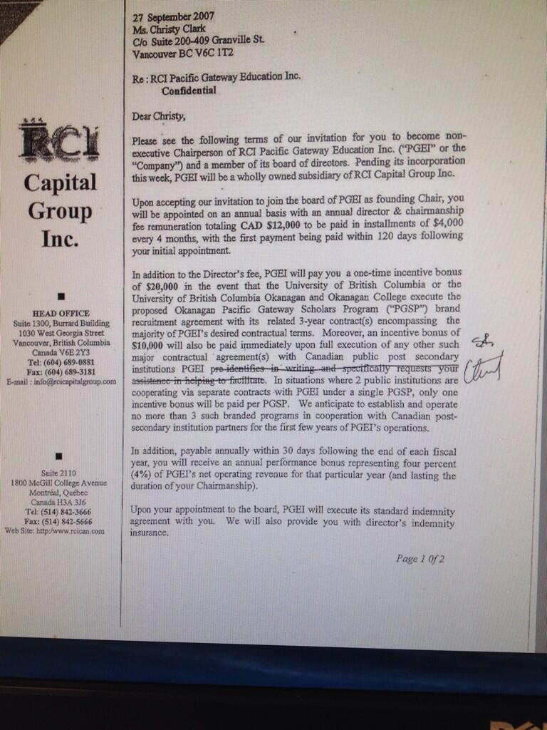Coincidentally RossK, the job offering letter from RCI Capital Group Inc. to Christy Clark is "C/o Suite, 200-409 Granville Street, Vancouver BC V6C 1T2"